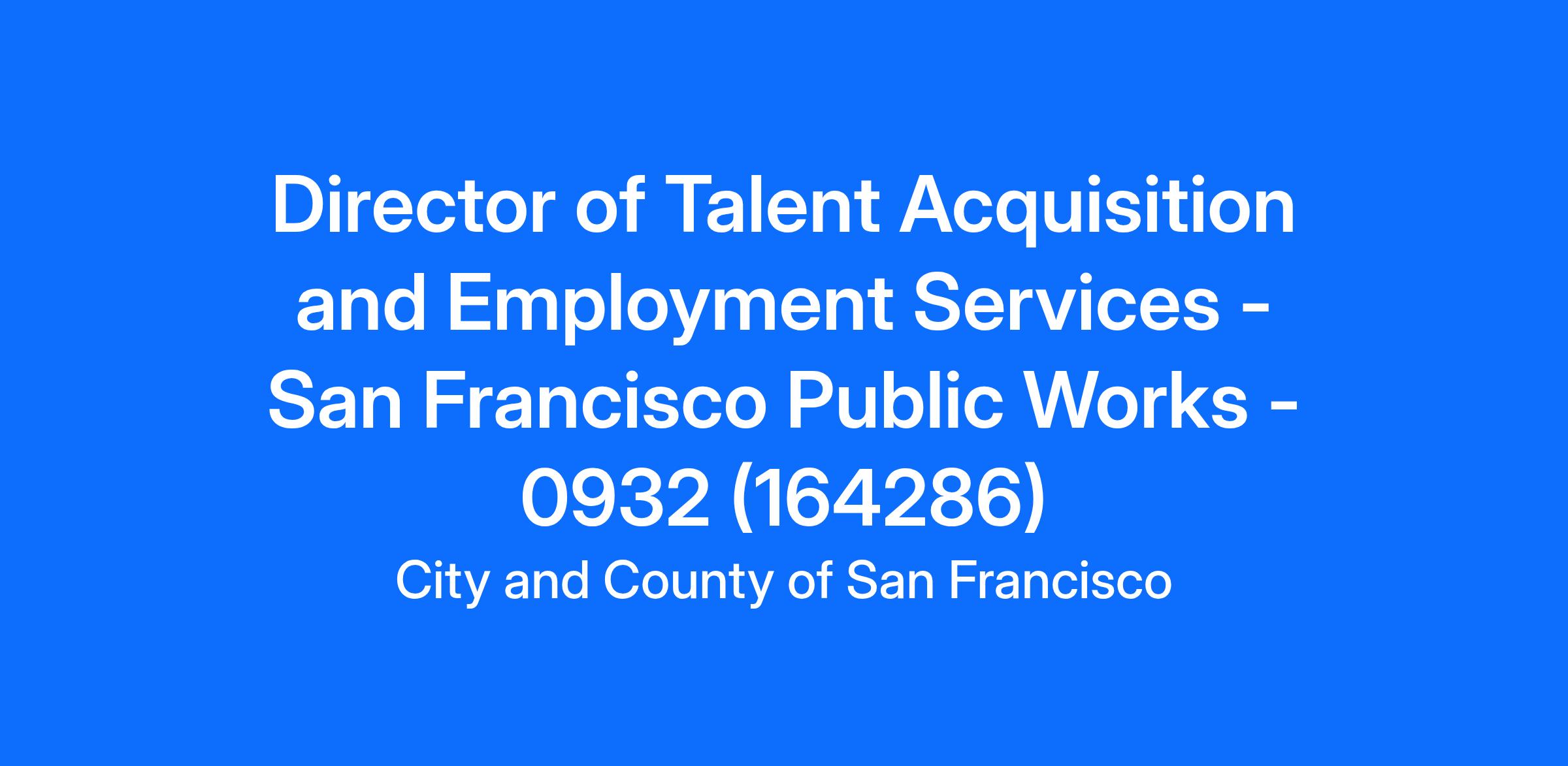 Under general administrative direction from the SFPW Human Resources Director, the Director of Talent Acquisition and Employment Services will develop strategies and work plans, supervise staff, research trends in relevant subject areas to inform and develop future plans, establish standard work, lead projects, and oversee cross-departmental collaboration to the success of different HR teams: Employment Services (HR Operations), Talent Acquisition (Exams)/Classification and Payroll. You will lead an innovative team of HR professionals by providing your expertise on special projects as assigned, many of which require your thoughtful management of sensitive communication with entities such as the City-wide Department of Human Resources, the Civil Service Commission, and other City departments, commissions, and boards on human resources-related matters, as well as compliance with staffing regulations. If you're excited to apply creative and modern approaches to develop solutions and projects to serve the needs of the many communities across San Francisco, you'll be interested in joining our Public Works HR team.